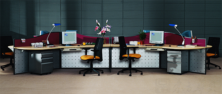 ※ 上款屏风为120度转角工作位子,弹性的多角度连结,活泼沟通办公空间,优雅创造各种角度,灵活整合空间运用。
