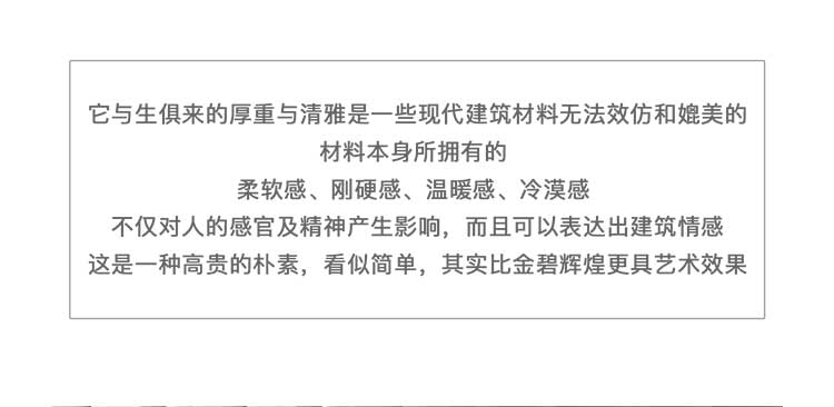 它与生俱来的厚重与清雅是一些现代建筑材料无法效仿和媲美的材料本身所拥有的柔软感、刚硬感、温暖感、冷漠感不仅对人的感官及精神产生影晌,而且可以表达出建筑情感这是一种高贵的朴素,看似简单,其实比金碧辉煌更具艺术效果。