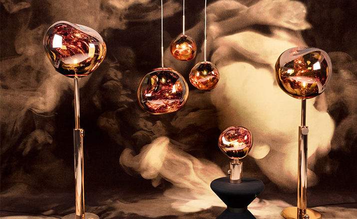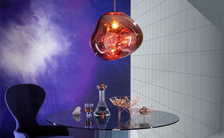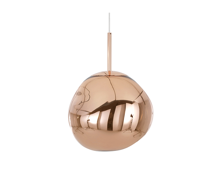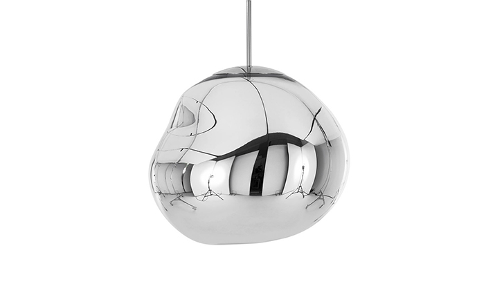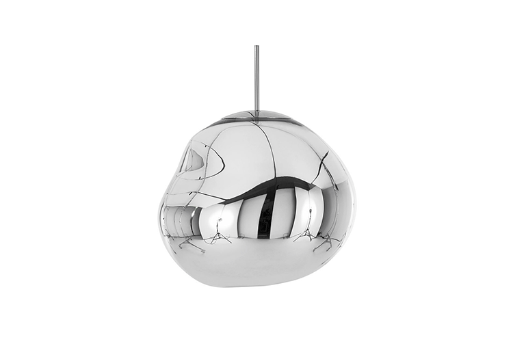 With Melt, Tom Dixon's experiments in the technologically advanced field of vacuum metallization takes on a new twist. Melt is a series of distorted spherical pendants born from a collaboration with Swedish radical design collective Front. The light bouncing and reflecting around the uneven surfaces creates a dramatic melting hot blown glass effect and an ethereal luminosity on their surroundings. Melt is translucent when on and mirror finish when off. Its internal luminosity is visible in full daylight. Available in two sizes and three finish options.