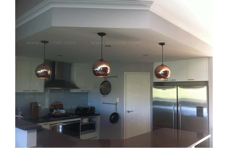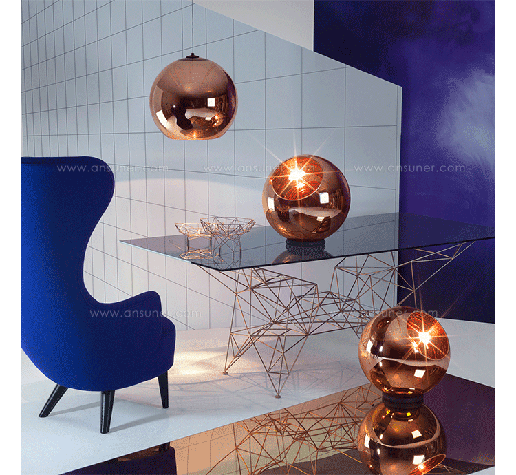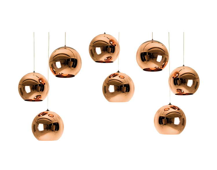 A pendant light made using copper, a material more commonly associated with solar cells and microwave radiation. The Copper Shade is created by exploding a thin layer of pure metal onto the internal surface of a polycarbonate globe. The result is a highly reflective surface with a warm metallic glow.
