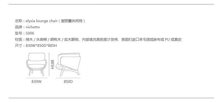 Elysia Lounge Chair(爱丽霞休闲椅)是意大利著名设计师Luca Nichetto的经典作品。Elysia Lounge Chair是高级木工和精细剪裁的完美结合。实木脚架精妙地固定着坐垫和靠垫,并巧妙的隐藏在衬垫里,外露的脚架同时展示了高超技艺和木材的优质。制作采用榉木/水曲柳/胡桃木/实木脚架、内部填充高密度沙发棉、表面扪进口羊毛绒或麻布或PU或真皮。