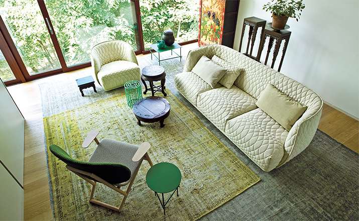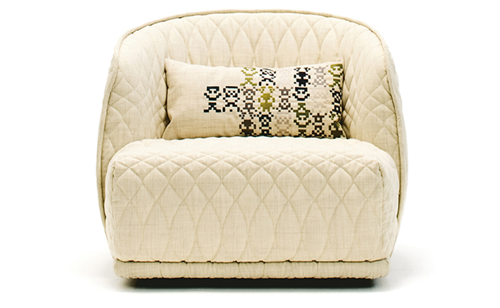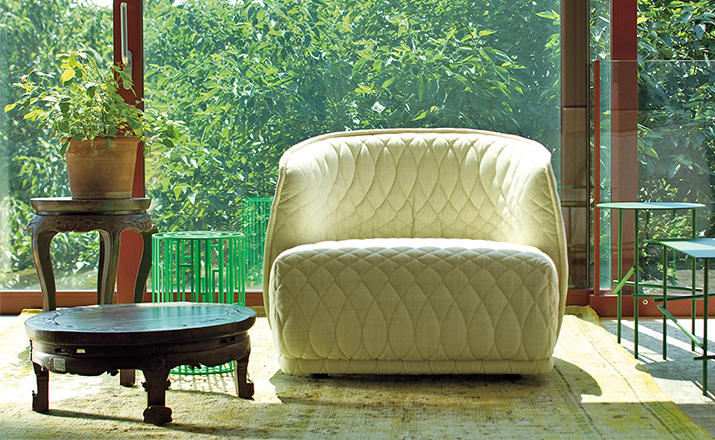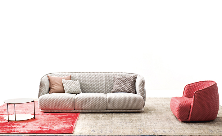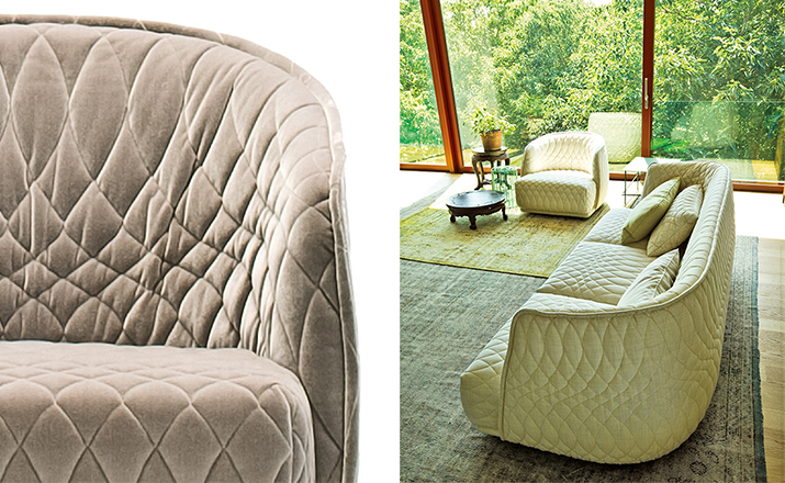 Redondo is a set of seating elements designed by Patricia Urquiola for Moroso.Its distinctive theme is roundness,and indeed the name in Spanish means“round”.The system comprises a sofa and two snug armchairs that evoke an almost "protective" intimacy.The line and form of the structure are reminiscent of a brandy glass:it consists of two adjoining volumes that together form a cocooning seat, like a shell.It does not require the addition of numerous cushions.Redondo's curved shapes are accentuated by the complete absence of corners and by the soft fabric,chosen to offer sensory stimulation,and embellished with a quilted decoration in which the thread,like a pencil,draws elegant three-dimensional geometries.