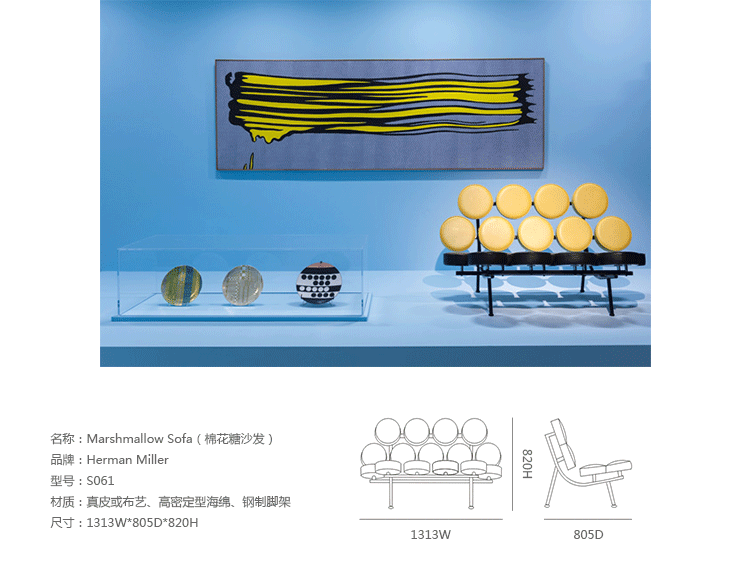 棉花糖沙发,英文名“Marshmallow sofa”,也叫鼓椅、向日葵椅,是设计师George Nelson在1956年设计的,这个设计用18个独立的圆形软垫组成座椅和靠背,“漂浮”在沙发框上。软垫的拆卸十分方便,可轻松完成保洁工作,并可交换各个软垫的位置以保持均匀的使用度,还可选择软垫的颜色,组合出全新的外观,因此很富于游戏感。米勒公司在推出这款产品的时候,说这个沙发是“第一款孕育着全新软椅概念的产品。我们觉得它不仅可以在家里使用,而且可以在与前者环境迥异的公共大厅内使用,它与众不同的外观无疑是公共场合的一道风景线。”软垫的色彩有单一色彩和多种色彩可选,适用范围很广,办公室、大厅、休闲室、客厅或书房等空间都可使用。