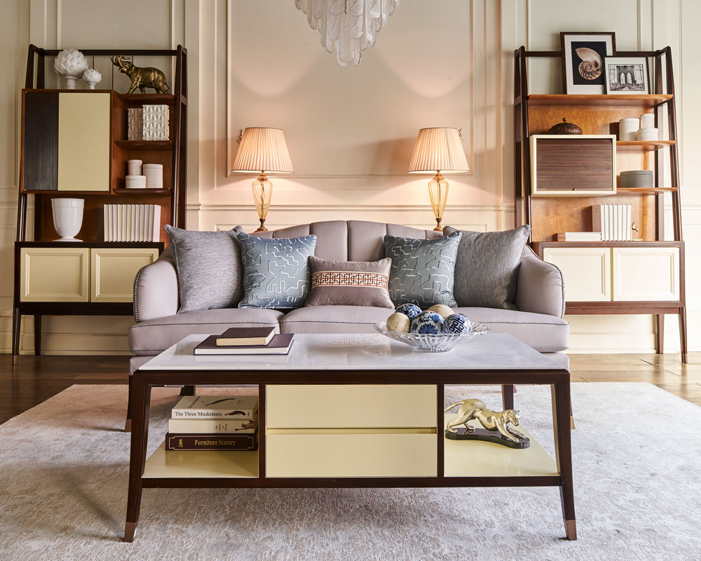浅灰与蓝灰的搭配,简洁雅致;以流畅的弧线贯穿整个靠背,符合人体工程学。完美的皮布结合工艺,由经验丰富的技师手工独立完成,确保美观、耐用,皮革耐污易打理,布艺给人柔软、舒适之感;铜脚,赋予中式韵味的同时以防磨损。