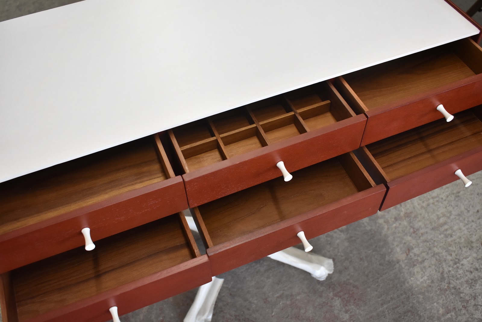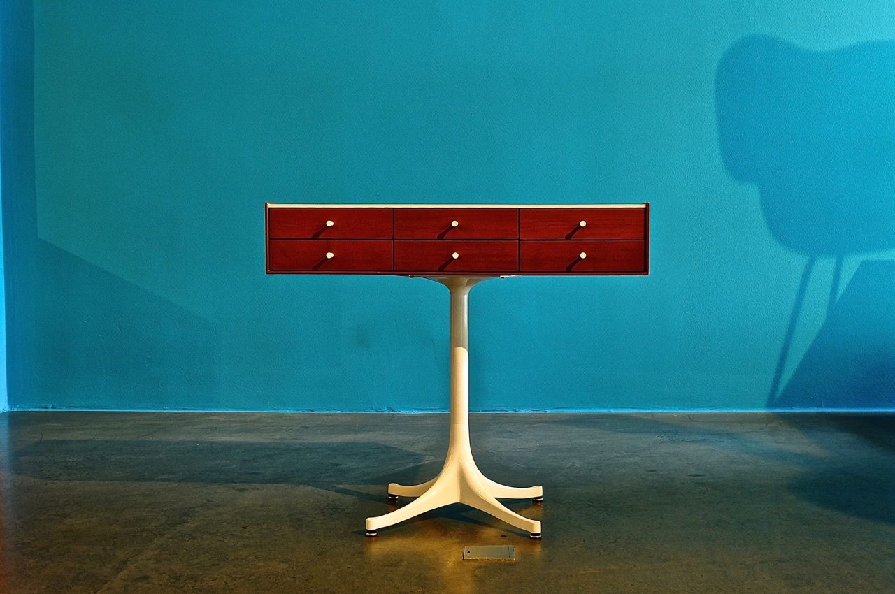 乔治·尼尔森(George Nelson)是美国极具影响力的建筑师、家具设计师和产品设计师,日本对George Nelson有着深远的影响。在他于1951年第一次到东京旅行,以及之后在那里的十几年,George Nelson迷上了日本的所有东西。这种影响最明显的的他于1952年设计的迷你箱。迷你箱的神奇处是可用来存放各种物品,是一个很多小抽屉小储物柜,方便您分类摆放各种生活物品。尼尔森设计的迷你箱最让人惊奇的是它几乎可以摆放在任何房间,无论是卧室,办公室,客厅等等任何您需要的地方,美观且不失和谐。每个抽屉都是木工们细心的安装设计,以保证高品质。抽屉采用胡桃或樱桃木皮贴面,基材为环保高密度板环保油漆喷涂、铸铝烤漆可调节脚架(4星级铝底座)、或玻璃钢一体成型脚架,抽屉贴心的配置有金属旋钮,方便打开与关上。