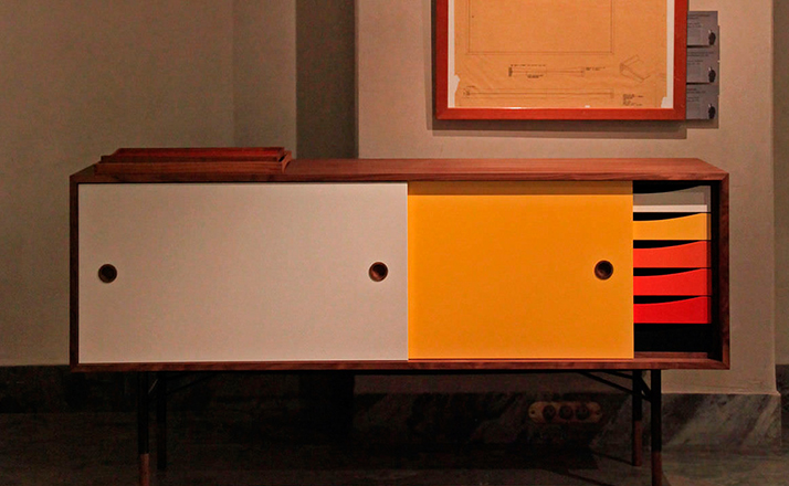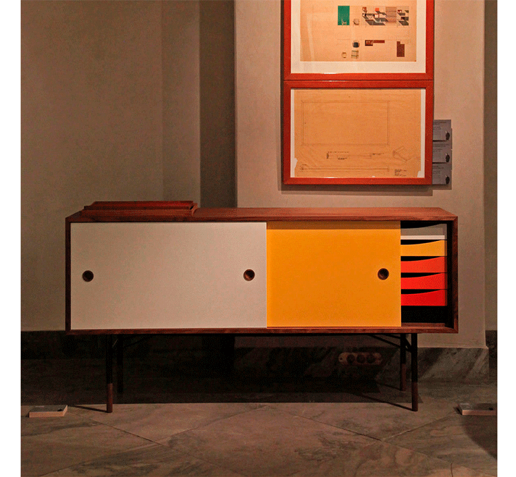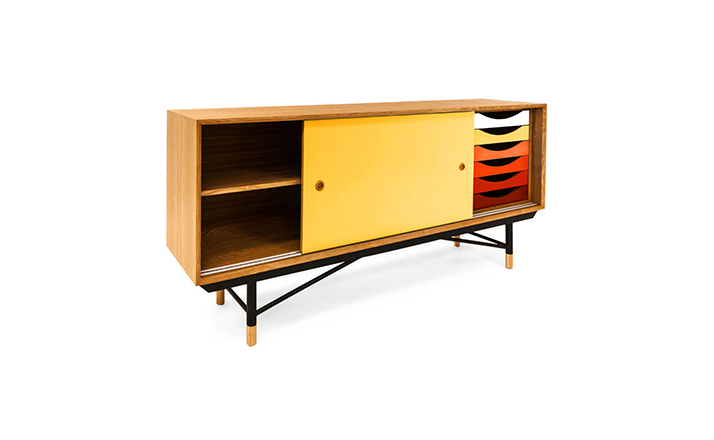 color theory sideboard(色彩理论餐边柜)是设计师Juhl Finn设计的,Kardiel公司制作的经典实木家具,1940年,他设计的第一张座椅、也是最经典的作品——《鹈鹕椅》(Pelican Chair),目前为纽约现代艺术博物馆 MOMA 所珍藏。彩色的滑动门与托盘餐具柜是1955年由Juhl Finn为BOVIRKE设计的。)是Kardiel公司制作的经典实木家具。复古但永不过时的木炭是和橙色,结合美国核桃开创了20中世纪六十年代中现代主义的时代。在现代主义的存储家具上, Finn Juhl和 Arne Vodder 最先尝试胶木和天然木的组合运用。这是大胆的创新,他们结合传统的新鲜的新兴技术与现代主义的概念。他们通过这些色彩绚烂的产品所实现的是令人印象深刻的比例的平衡。制作采用精选MDF板基材胡桃木皮或水曲柳贴面、五金脚架、环保油漆喷涂、做工精湛。颜色元素的使用反映了他迷恋歌德的著名彩色圈,颜色处于和谐的凝聚力。