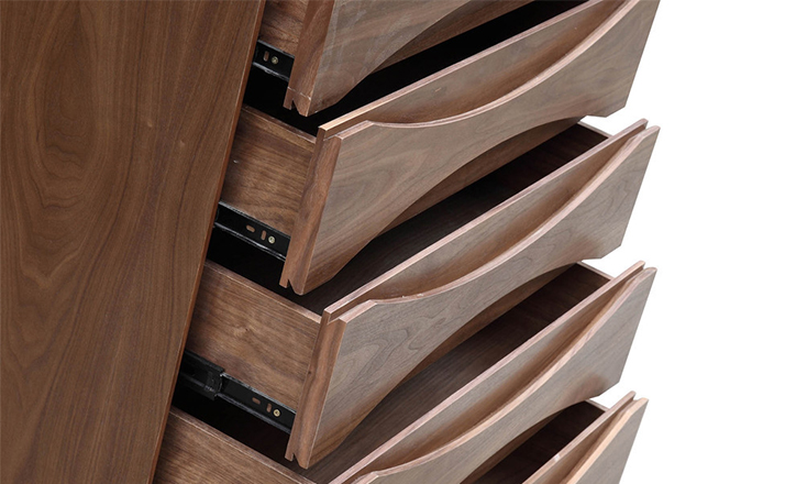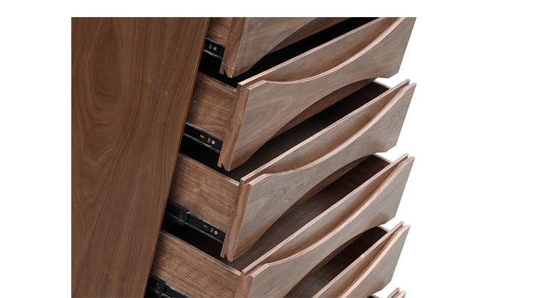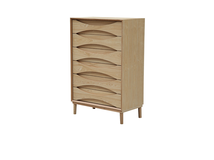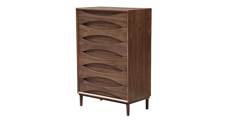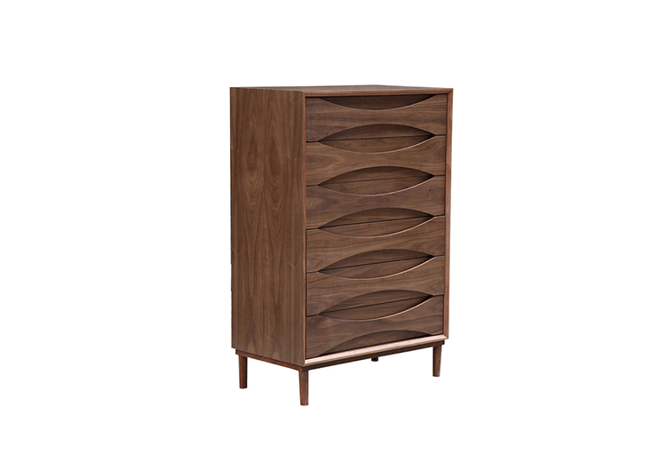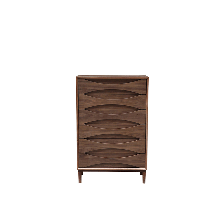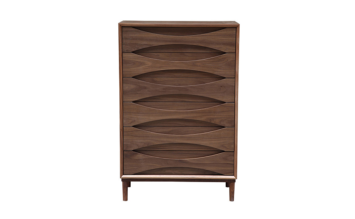 arne vodder retro tall boy dresser(arne vodder复古高男孩梳妆台)是Kardiel公司制作的经典实木家具,具有世纪中期的现代风格,6个滑动式抽屉通过精心制作,提供足够的空间存放衣物或其他物品。在现代主义的存储家具上, Finn Juhl和 Arne Vodder 最先尝试胶木和天然木的组合运用。这是大胆的创新,他们结合传统的新鲜的新兴技术与现代主义的概念。制作采用精选MDF板基材胡桃木或水曲柳木皮贴面、胡桃实木或水曲柳实木脚架、环保油漆喷涂、做工精湛。