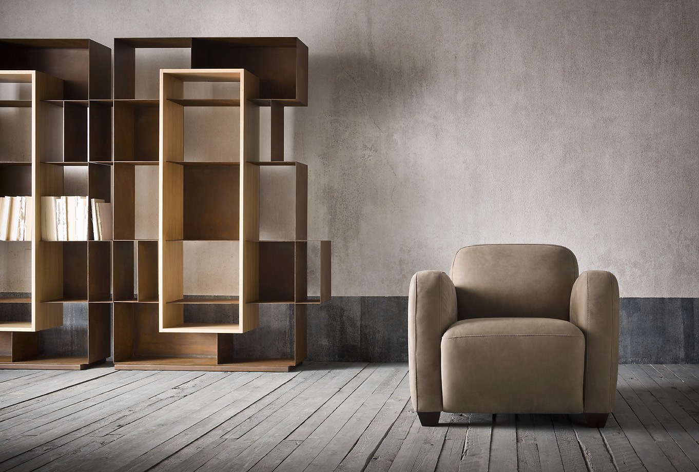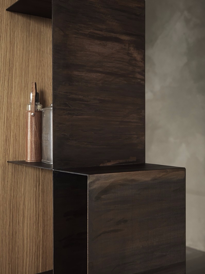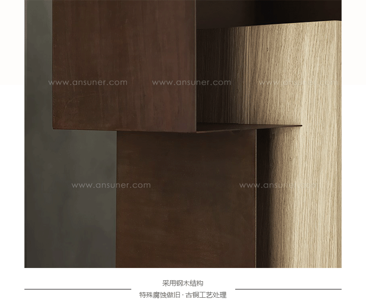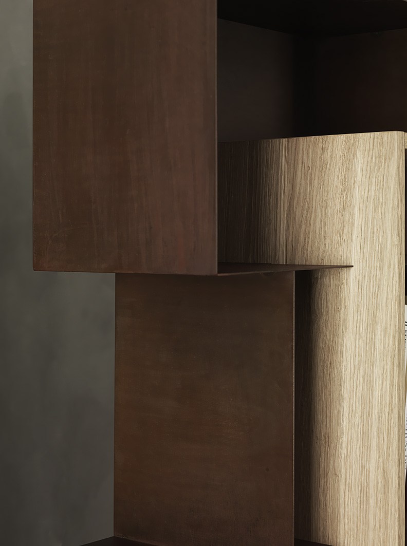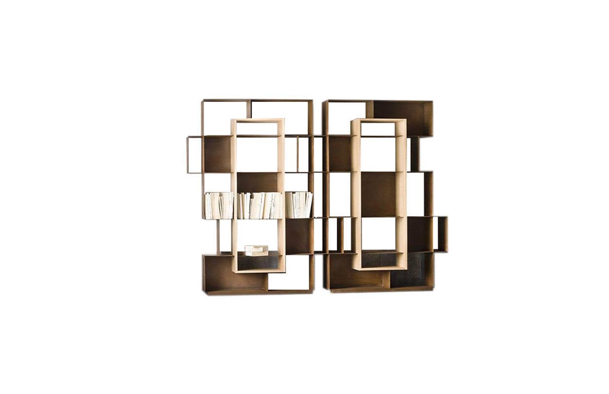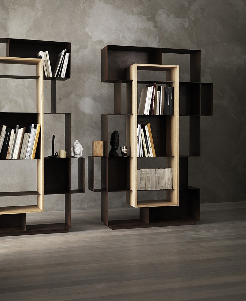 优雅的简单对象的成色瓶架、书架可与天然橡木插入或翁é完成铜绿耐候完成彩色木插入.