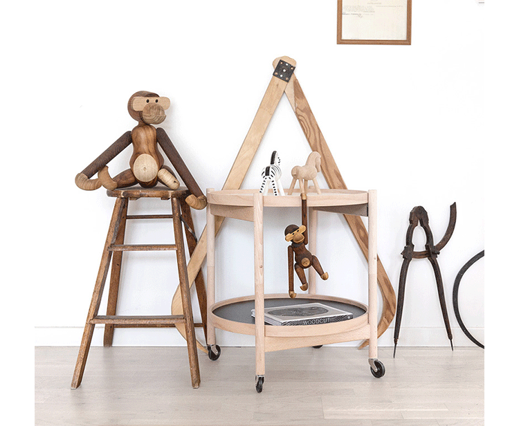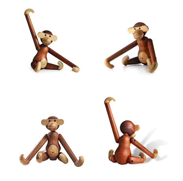 Kay Bojesen Monkey(Kay Bojesen 猴子)出自丹麦设计大师 Kay Bojesen 的设计作品,设计于1951年,精致的木制动物系列,是 Kay Bojesen 为人熟知的珍藏作品系列,采用不同的橡木、枫木、柚木等原木素材,保留木材的独特纹理,刻画出各种不同让人莞尔一笑的动物姿态,跳脱生活中的烦琐与紧张,简单的玩偶,轻松的神情,带您回归孩时的天真与简单快乐。精致而限量珍藏的作品系列,适合您作为桌面摆设,或是作为送礼小物,分享您生活中的快乐写意。可爱的小猴,可摊坐、吊挂树上、摇晃走路等,自在摆出您喜爱的完美姿态。英国著名杂志 Wallpaper,曾一次摆出 50 只不同姿势的猴子,带动您的全面想象和创造力。
