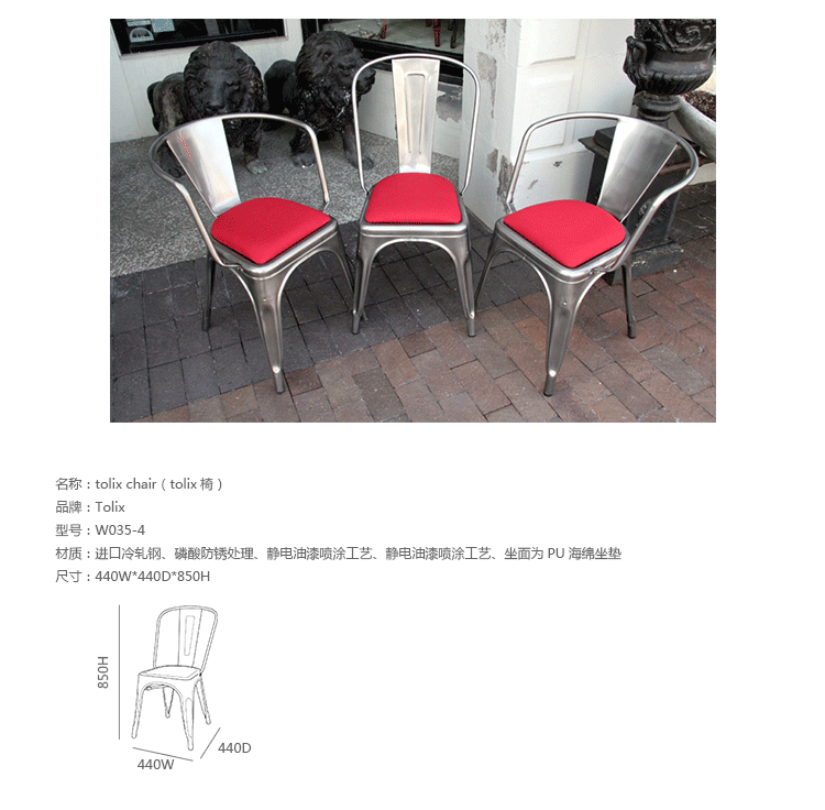 tolix chair(tolix椅)一把有味道、有态度的椅子,据说它最开始被使用在一艘战舰的天气预报房间里,故事的真实性与否不得而知,但是不影响其成为享誉世界的著名设计家具,1934年由Xavier Pauchard设计,早期是作为户外用家具设计,力图展现法式慵懒而闲适的气质,经年而来被全世界时尚设计师所宠爱,从室外扩展到家居、商业、展示等多个用途,而此椅也不负众望在各类空间中均有上佳表现,特别是近年来与混搭、乡村、美式、怀旧、北欧简约、中式等主要装修风格搭配,都呈现出独特的韵味,也被时尚界赞为“百搭第一”椅,可以用在酒吧,餐馆,咖啡馆等等地方,之后通过改进,设计出有扶手版本的tolix armchair(tolix扶手椅),高背版本的tolix high back bar stool(tolix高背吧凳),宽背版本的tolix wide back bar stool(tolix宽背吧凳),及tolix bar stool(tolix吧凳)和tolix mini stool(tolix迷你凳)。制作采用进口冷轧钢、磷酸防锈处理、静电油漆喷涂工艺、坐面为木板或PU海绵坐垫,颜色可选。