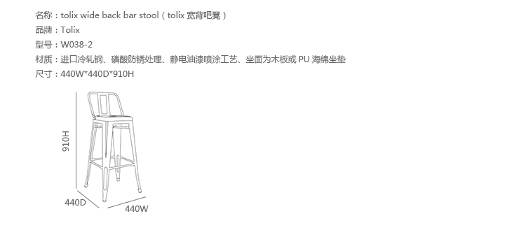 tolix chair(tolix椅)一把有味道、有态度的椅子,据说它最开始被使用在一艘战舰的天气预报房间里,故事的真实性与否不得而知,但是不影响其成为享誉世界的著名设计家具,1934年由Xavier Pauchard设计,早期是作为户外用家具设计,力图展现法式慵懒而闲适的气质,经年而来被全世界时尚设计师所宠爱,从室外扩展到家居、商业、展示等多个用途,而此椅也不负众望在各类空间中均有上佳表现,特别是近年来与混搭、乡村、美式、怀旧、北欧简约、中式等主要装修风格搭配,都呈现出独特的韵味,也被时尚界赞为“百搭第一”椅,可以用在酒吧,餐馆,咖啡馆等等地方,之后通过改进,设计出有扶手版本的tolix armchair(tolix扶手椅),高背版本的tolix high back bar stool(tolix高背吧凳),宽背版本的tolix wide back bar stool(tolix宽背吧凳),及tolix bar stool(tolix吧凳)和tolix mini stool(tolix迷你凳)。制作采用进口冷轧钢、磷酸防锈处理、静电油漆喷涂工艺、坐面为木板或PU海绵坐垫,颜色可选。