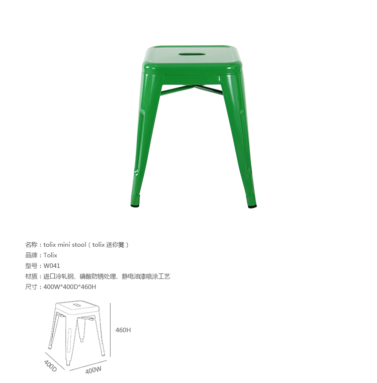 tolix chair(tolix椅)一把有味道、有态度的椅子,据说它最开始被使用在一艘战舰的天气预报房间里,故事的真实性与否不得而知,但是不影响其成为享誉世界的著名设计家具,1934年由Xavier Pauchard设计,早期是作为户外用家具设计,力图展现法式慵懒而闲适的气质,经年而来被全世界时尚设计师所宠爱,从室外扩展到家居、商业、展示等多个用途,而此椅也不负众望在各类空间中均有上佳表现,特别是近年来与混搭、乡村、美式、怀旧、北欧简约、中式等主要装修风格搭配,都呈现出独特的韵味,也被时尚界赞为“百搭第一”椅,可以用在酒吧,餐馆,咖啡馆等等地方,之后通过改进,设计出有扶手版本的tolix armchair(tolix扶手椅),高背版本的tolix high back bar stool(tolix高背吧凳),宽背版本的tolix wide back bar stool(tolix宽背吧凳),及tolix bar stool(tolix吧凳)和tolix mini stool(tolix迷你凳)。制作采用进口冷轧钢、磷酸防锈处理、静电油漆喷涂工艺、坐面为木板或PU海绵坐垫,颜色可选。