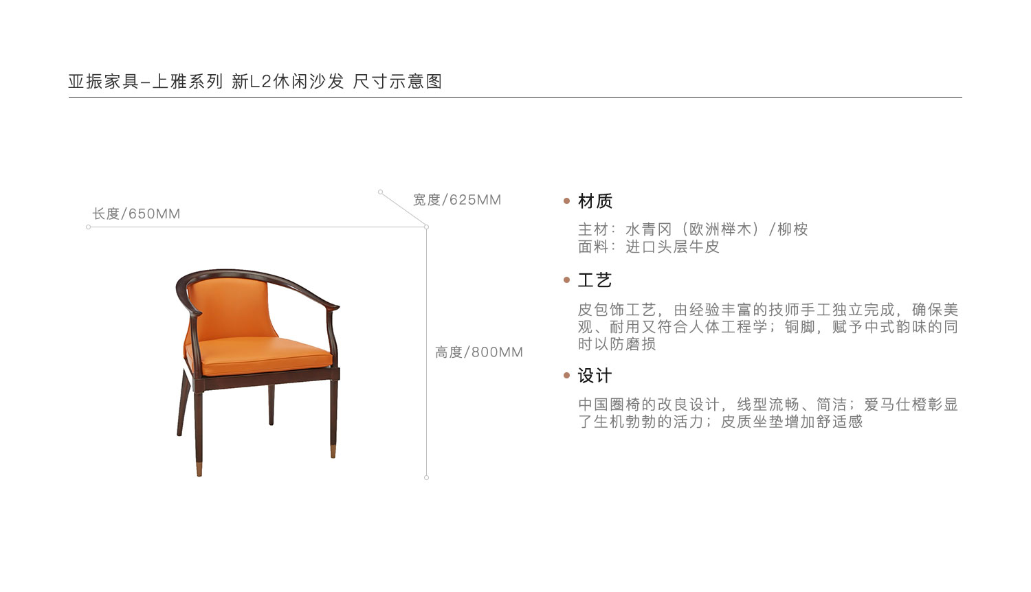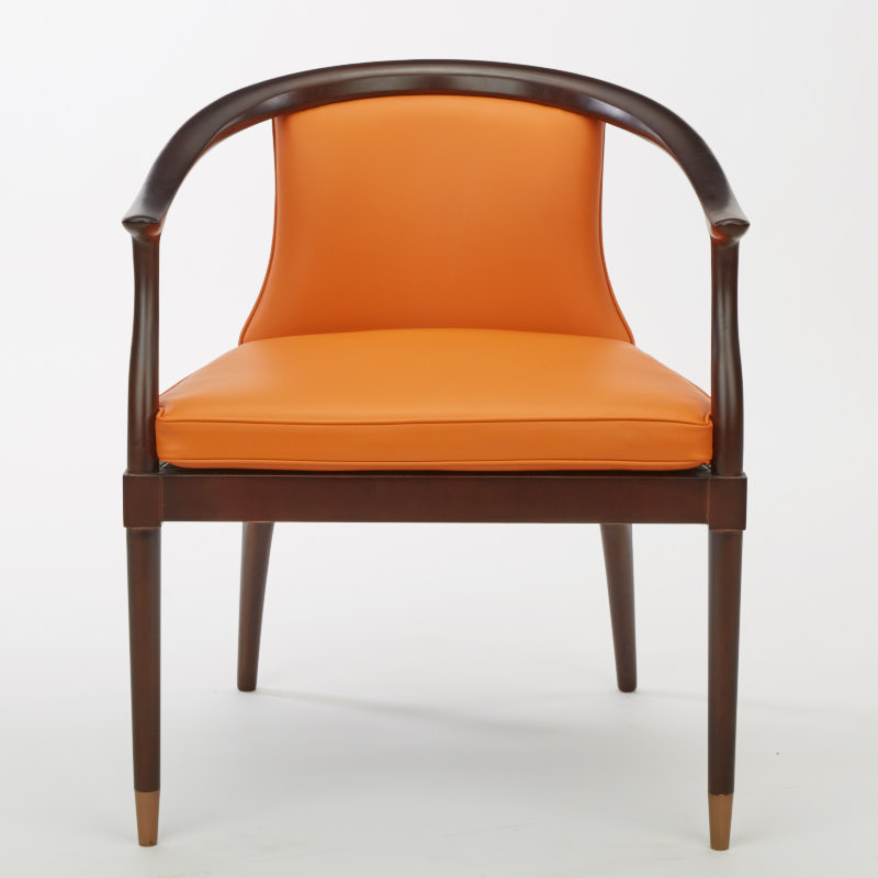 皮包饰工艺,由经验丰富的技师手工独立完成,确保美观、耐用又符合人体工程学;铜脚,赋予中式韵味的同时以防磨损。中国圈椅的改良设计,线型流畅、简洁;爱马仕橙彰显了生机勃勃的活力;皮质坐垫增加舒适感。