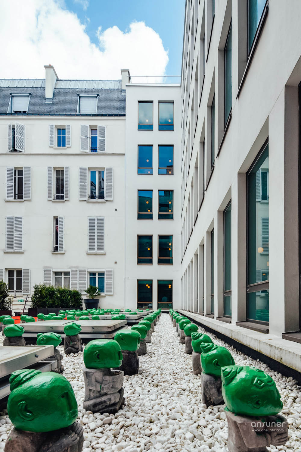 底层庭院还装饰以“护卫绿军”,这些及膝的石雕采购于南太平洋岛国巴布亚新几内亚,雕塑的头颅被 Angel 涂上了一层荧光绿色,从而变得更具当代艺术特质。