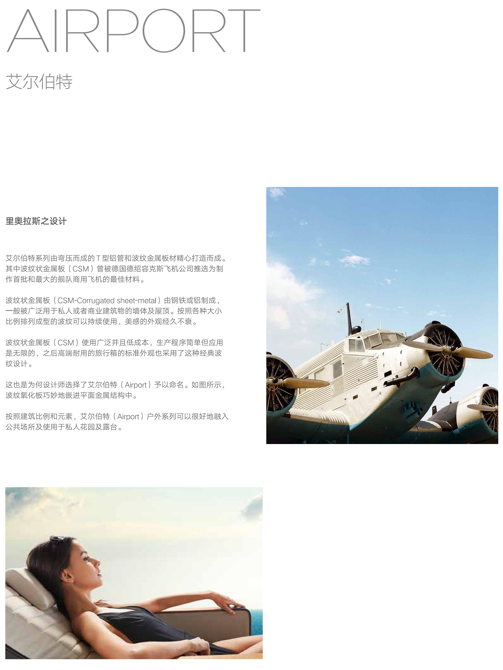 艾尔伯特系列由弯压而成的 T 型铝管和波纹金属板材精心打造而成。 其中波纹状金属板(CSM)曾被德国德绍容克斯飞机公司推选为制 作首批和最大的舰队商用飞机的最佳材料。 波纹状金属板(CSM-Corrugated sheet-metal)由钢铁或铝制成, 一般被广泛用于私人或者商业建筑物的墙体及屋顶。按照各种大小 比例排列成型的波纹可以持续使用,美感的外观经久不衰。 波纹状金属板(CSM)使用广泛并且低成本,生产程序简单但应用 是无限的,之后高端耐用的旅行箱的标准外观也采用了这种经典波 纹设计。 这也是为何设计师选择了艾尔伯特(Airport)予以命名。如图所示, 波纹氧化板巧妙地嵌进平面金属结构中。 按照建筑比例和元素,艾尔伯特(Airport)户外系列可以很好地融入 公共场所及使用于私人花园及露台。