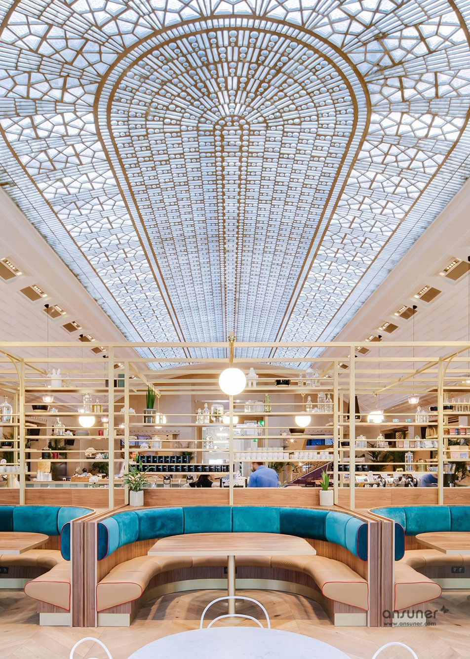 恢宏、华丽又明亮的玻璃穹顶带来令人震撼的空间视觉。跨越11层,新的办公空间保留了20 世纪 20 年代的经典装饰图形,在丰富的金属色和奢华的纺织面料衬托下,彰显出强烈的Art Deco装饰主义风格。在向这个城市的历史致敬的同时,又赋予其现代化的精髓。