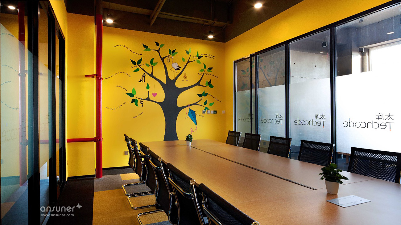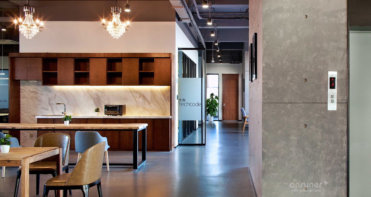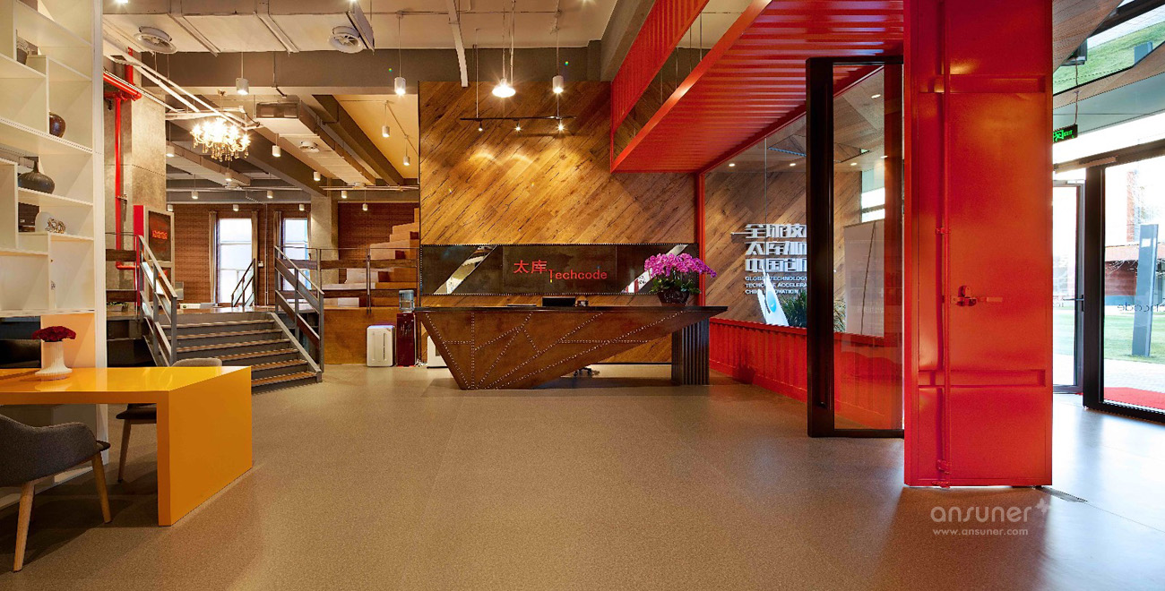 入口处醒目的大红色门厅,墙壁饰面采用集装箱纹理,与接待台后的木色饰面即形成了鲜明对比,同时又烘托出了温暖、开放的环境氛围,独特的工业风格特色让人第一眼就留下深刻印象。铁制的接待台经过特殊锈化处理,展现出了斑驳仿旧的视觉效果。