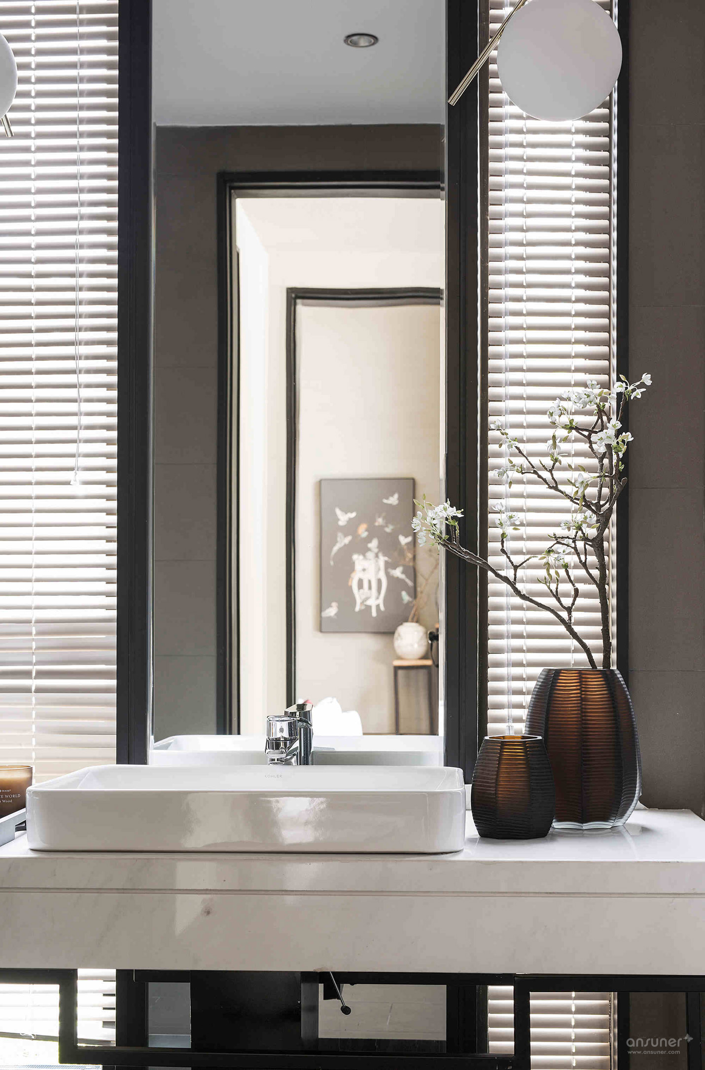 卫生间:卫生间及其它公共区域,凝聚现代人文情调的中式花艺,在悠然自得低诉生活的诗意与温情。