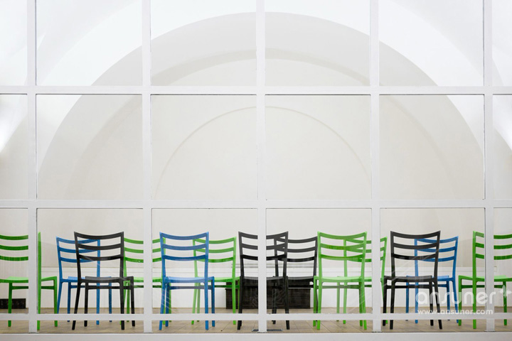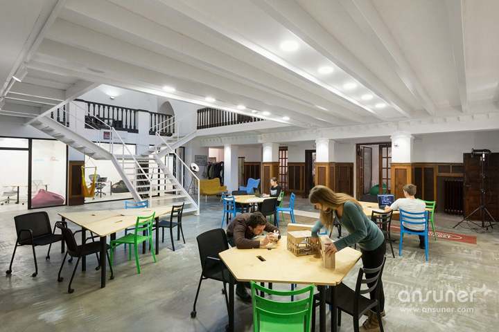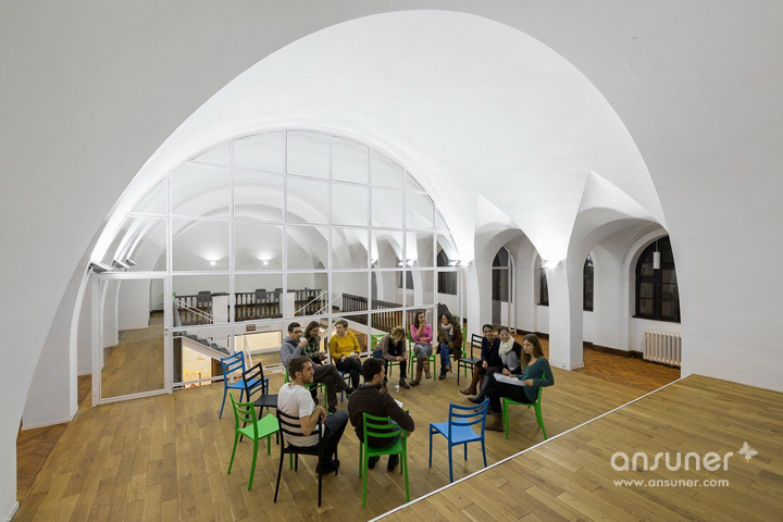 灵感的触动对于一个设计师,思考者来讲非常重要,IImpact Hub专业提供独特的系统资源、灵感和合作服务,帮助他们快速成长。教堂形的两层建筑大厅,分成三个双柱廊式拱券通道,并覆盖着大大的拱顶。因为功能需求,重新规划空间组织,一楼包括四间办公室、两间会议室、两个电话亭、厨房和厕所。所有这些功能都围绕中心共享工作空间而设。二层的平台,即可用作工作空间亦可在灿烂的夏日用作社交活动。