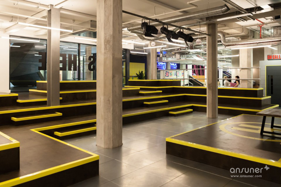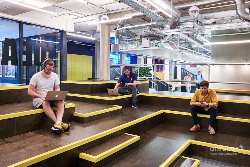 这是一处关注健康而又令人振奋的联合办公空间。这里不仅有常规的私人办公桌、专注工作区和开放热点工作台,同时还设计了大量满足工作所需的多元空间、以及不同的环境氛围和必备的功能。平面规划包括: ▼300人座的大礼堂,以染色夹板制作的阶梯式座位并配以专业的舞台灯光,可以直接从Huckletree和Alphabeta中庭进入,这里经常会为其会员和公众举办相关活动;