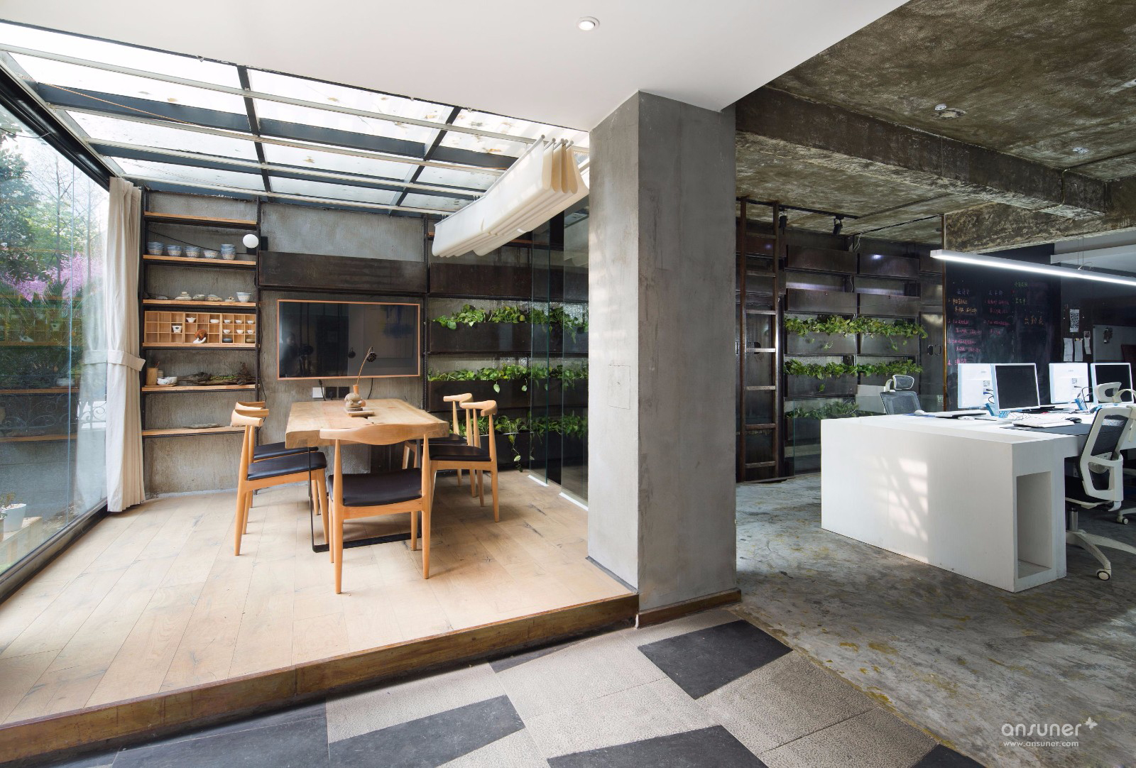 办公空间一共分为上下两层,上层是日常的办公空间,所有墙面的色泽深浅变化与印压痕迹,打造出新旧交融的后现代风格空间,独具粗犷的美感,。办公桌椅及办公用具皆采用白色,与空间色调搭配既和谐又现代。场地对角线处隔出一个玻璃空间和木框空间,采用半隔断的方式使空间的划分自由度很高,平常可用于简单的会议和会客,通透的玻璃天花板让采光变的更通透,再配以随时开合的玄色卷帘,显得极为体贴温馨。