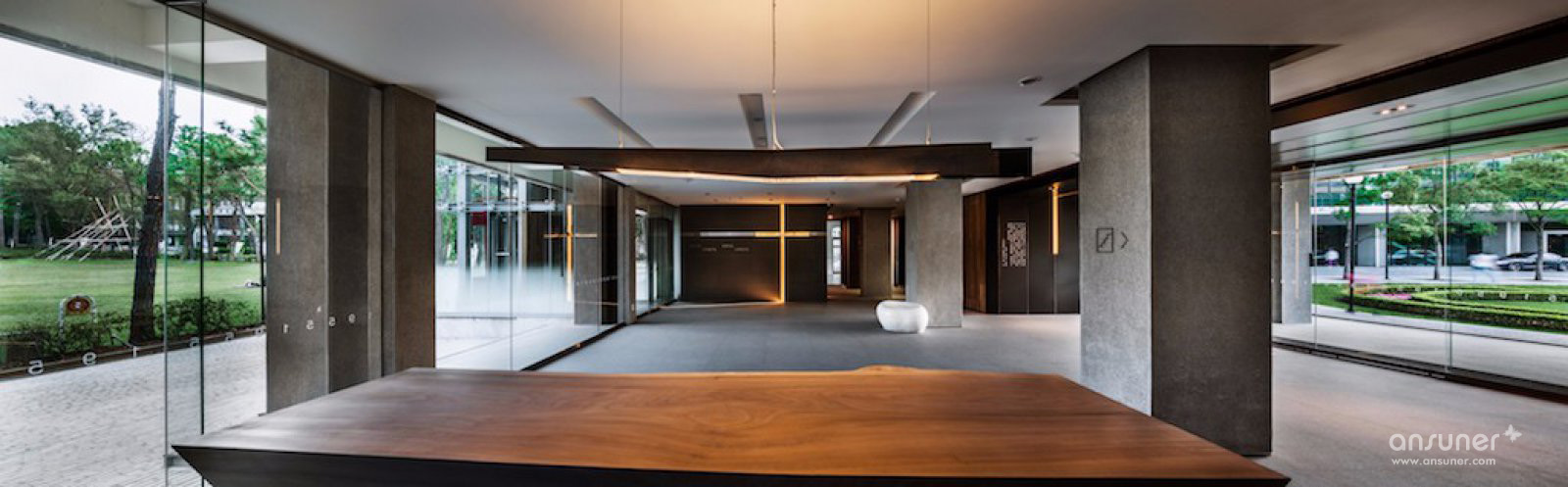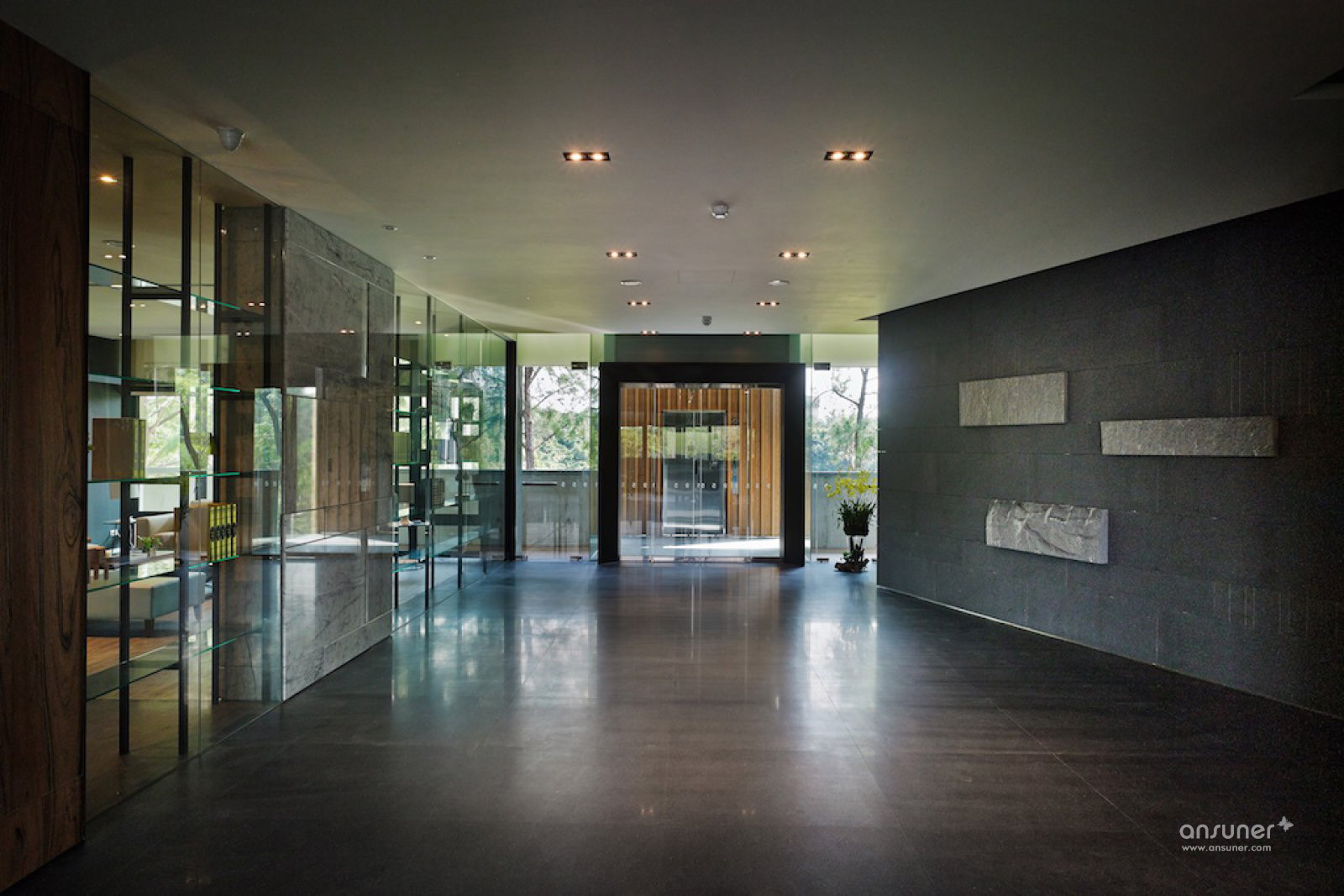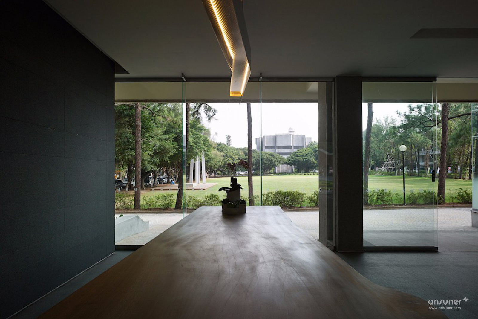 建筑物一楼以最少的墙体包覆,开放的设计,有光流泄,有风在动,透明的空间容器被户外的草皮绿意围绕。