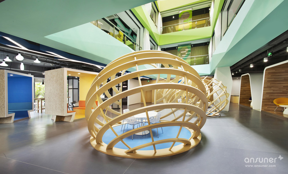 整个中庭为本案的亮点。设计师利用建筑的结构优点,并为了更好地展示出每层的特色,采用了腾讯文化中的几个主色调,不同的色调代表着每层的空间色彩效果。为了使中庭的空间感更为突出并结合设计理念中的造型元素,每层楼板外立面及柱体,都运用了立体式折线的效果。从中庭对应的一楼休闲区也设计了三组采用地球轴线组合而成的有趣的休闲讨论区,既有开放的效果,又有一定的分割隐私作用。